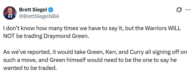 Siegel转发了Fischer的报道,并写道:“我真的不知道这句话还要强调多少遍:勇士队绝对不会交易格林。正如我们此前所报道的,这样的交易想要达成,必须得到格林、科尔和库里三人的一致同意,而且必须是格林本人主动提出想要离队才行。”