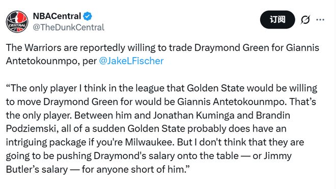 北京时间12月12日,据名记Fischer报道,勇士只愿意为得到字母哥送出格林,而另一位名记Siegel跟进表示,勇士目前并无交易格林的计划。