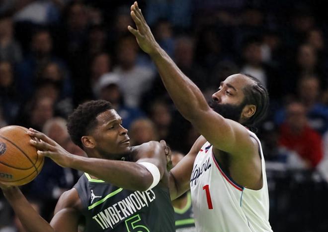 哈登和爱德华兹回来后,双方的进攻好起来。哈登和卡子哥连续得分,分差奔着20分去了。森林狼没有崩盘,爱德华兹和兰德尔强攻打出一波8-0。哈登突分柯林斯三分止血,然后连续造罚篮,让快船队保持两位数的优势。
